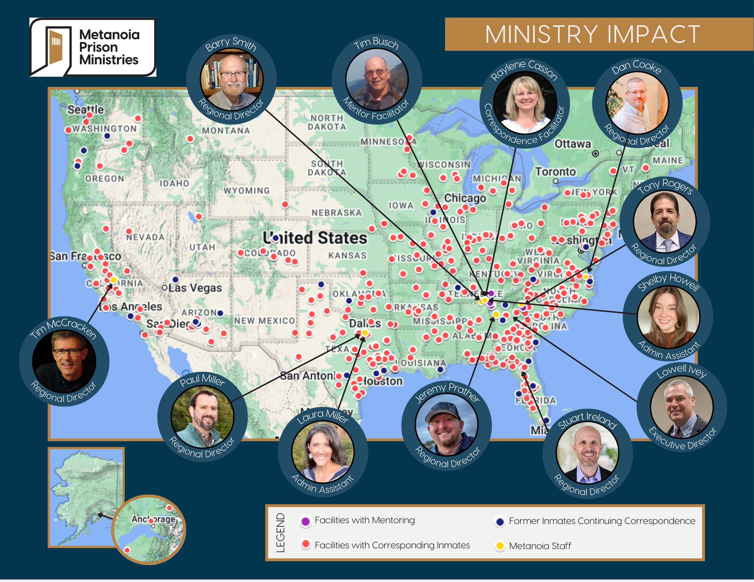 The map displays the Regional Director for each area as well as all of our mentoring and correspondence facilities.